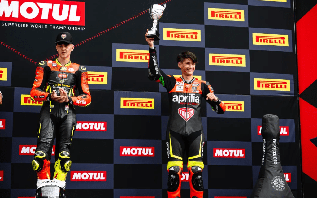 Il Trofeo Aprilia RS660 è stato protagonista a Misano nel weekend del Campionato del Mondo Superbike. Pole position e podio per Revo Nuova M2 con Filippo Bianchi, in lotta per il successo Lorenzo Sommariva.